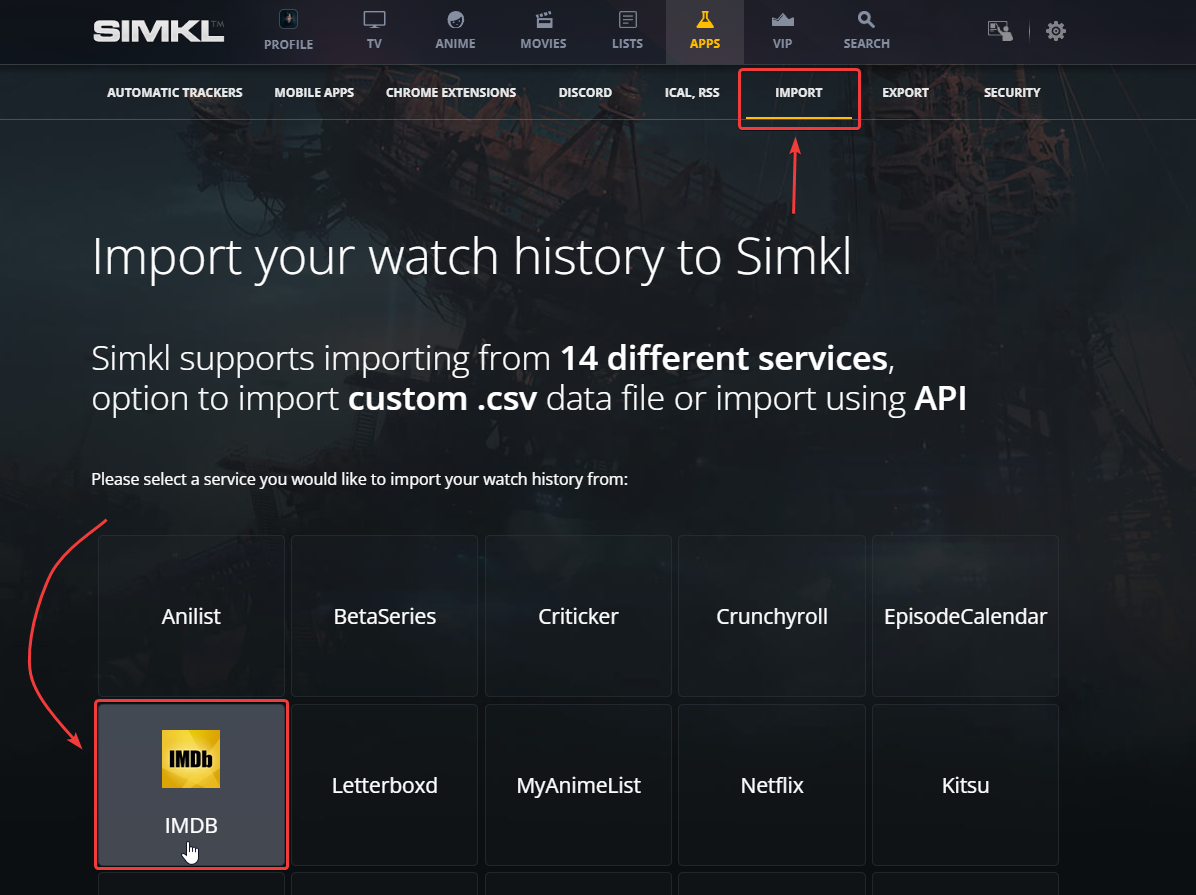 * **Navigate to Import:** Inside your SIMKL account, locate the import section. You'll find various import options, including IMDb.