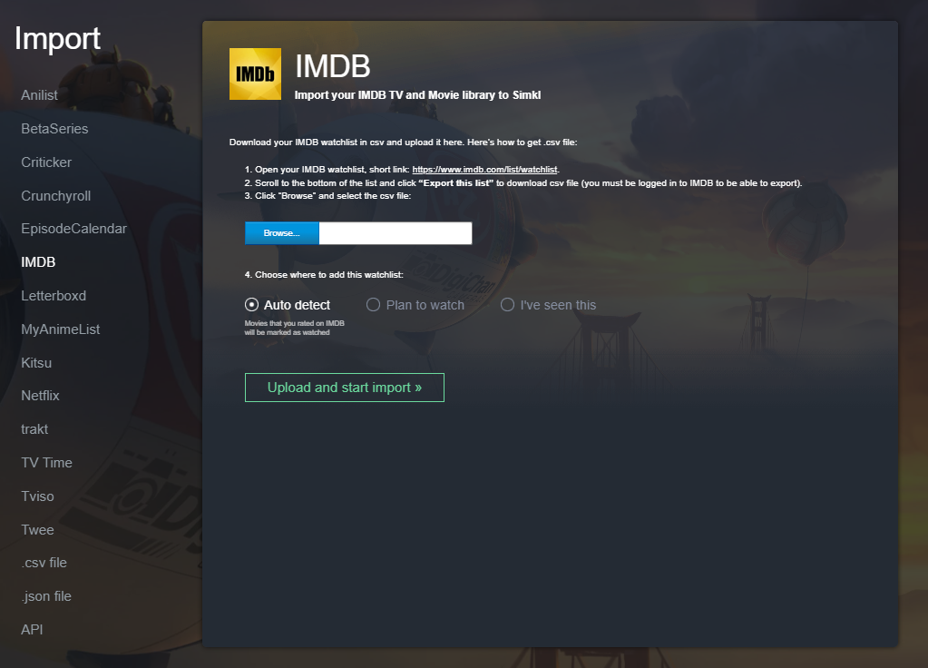 * **Upload the CSV File:** Return to SIMKL's import page, click "Browse," and select the CSV file you downloaded from IMDb.