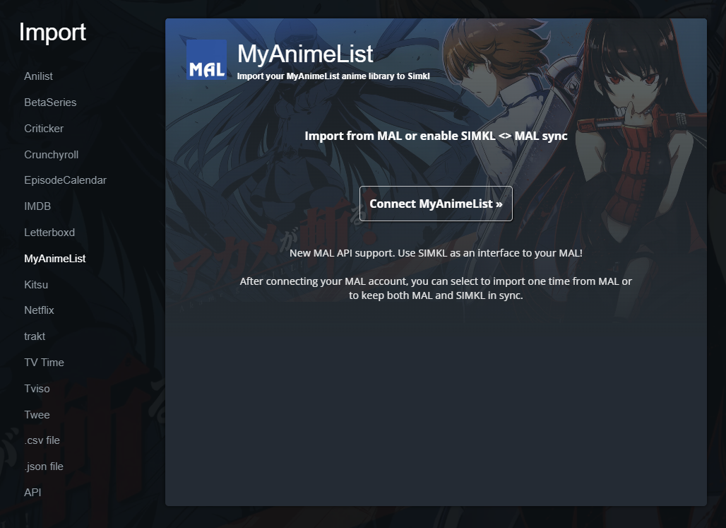 SIMKL now supports MyAnimeList's new API, making it easier than ever to connect and import your anime data. This new integration ensures a seamless experience as you transfer your watch history from MAL to SIMKL. **\[Use SIMKL as an interface to your MAL]**