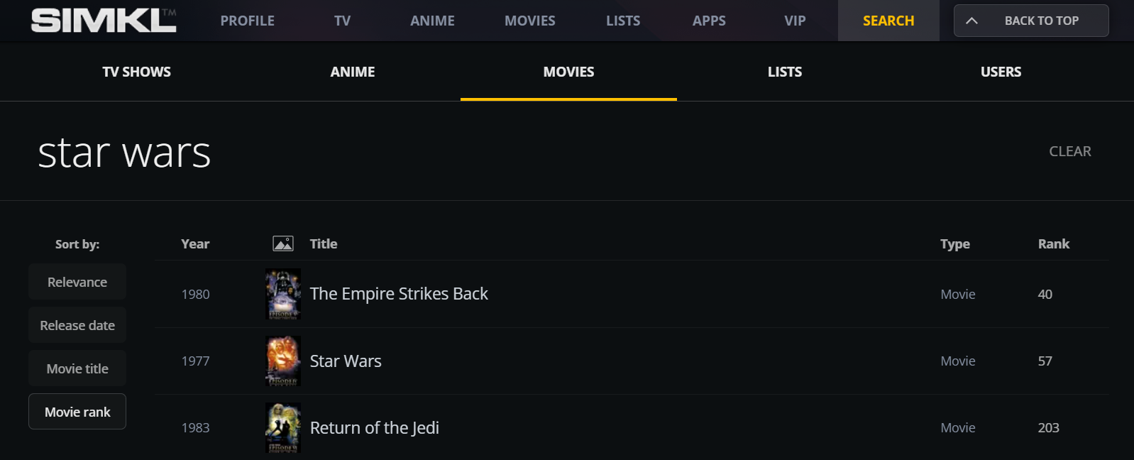 By using these category-specific tabs on Simkl's website, you can quickly and efficiently find the content you're looking for without having to sift through unrelated results.