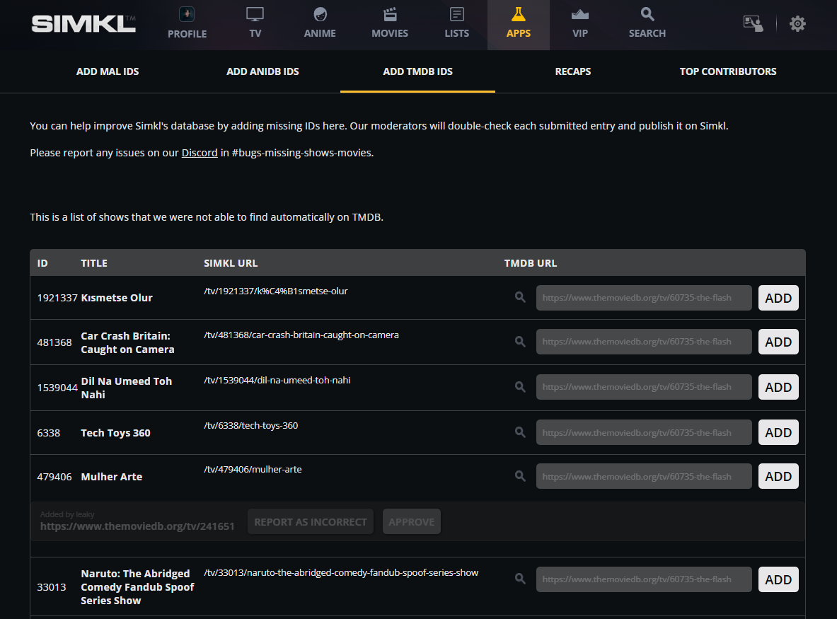Whether you’re passionate about Anime, TV shows, or Movies, your efforts ensure that fellow users can seamlessly navigate between Simkl and external platforms like MAL, AniDB, and TMDb. Start mapping IDs today and watch your name climb the leaderboard!