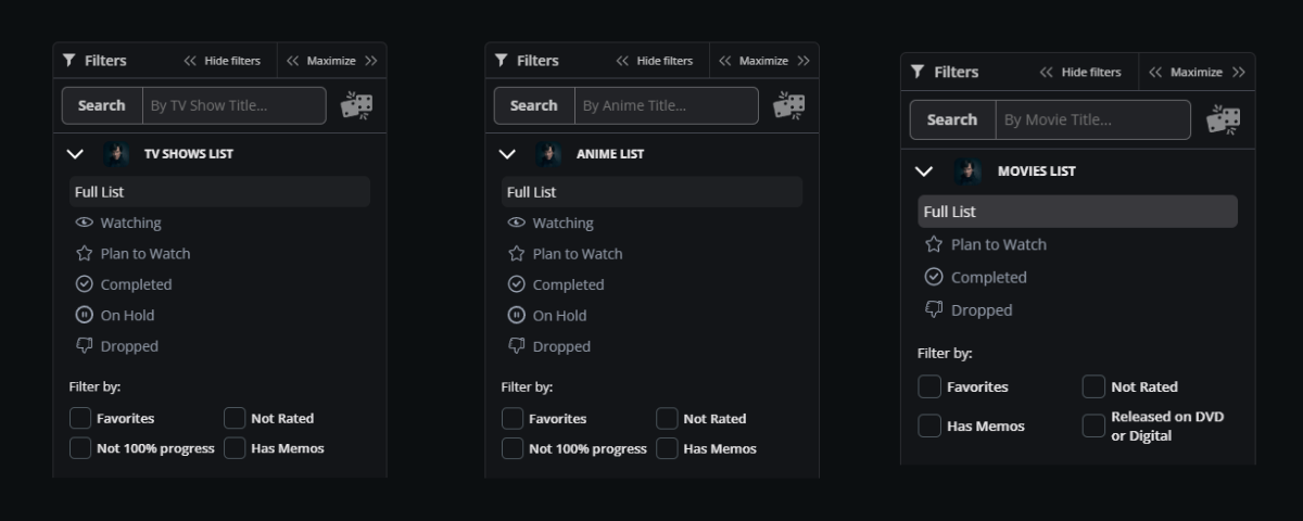 Watchlists are a core feature of Simkl that allows members to categorize and manage their TV shows, movies, and anime.