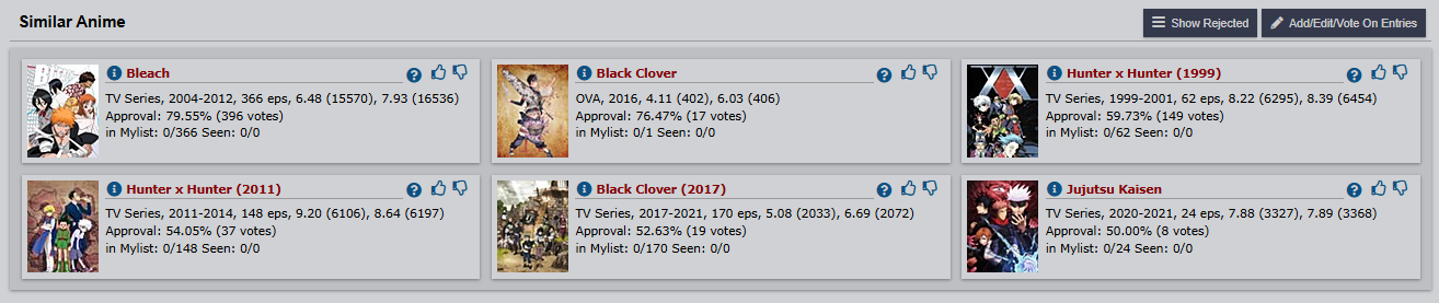 * Missing Similar Anime Entries: Sometimes anime that share a similar premise, genre, or themes are not linked, which can limit discoverability for users interested in finding content with similar qualities.