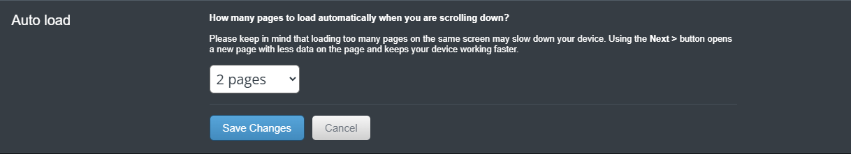 Set how many pages automatically load as you scroll down. Be mindful that loading too many pages at once can slow down your device. Alternatively, using the Next > button loads a new page with fewer items, improving performance.