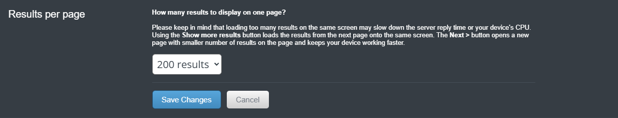 Choose how many items display per page when browsing lists. More results mean fewer page loads but can slow down response times. You can use the Show More Results button to load additional results without leaving the page.
