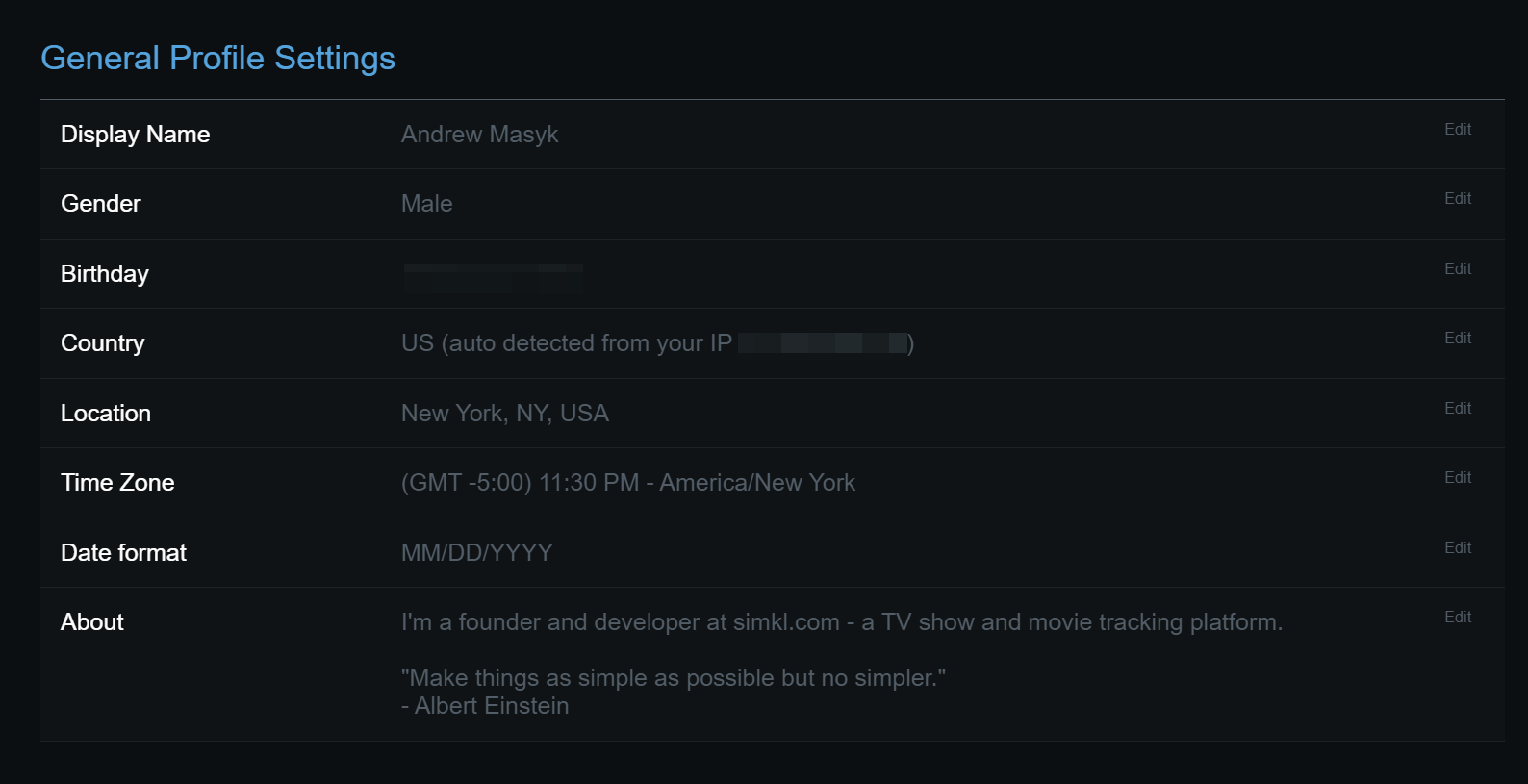 Your birthday on Simkl helps personalize your experience and allows you to share your age with friends if you choose. You can update or hide this information at any time.