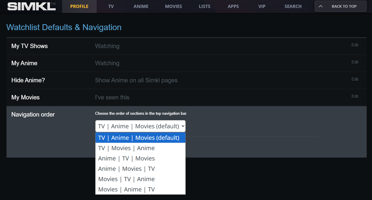 Yes. SIMKL allows you to customize the top navigation menu order (TV, Anime, Movies) directly from your profile settings.