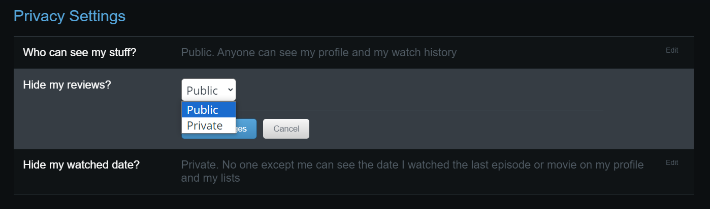 * Public: Anyone can see your reviews on Movies, TV Shows, Anime pages