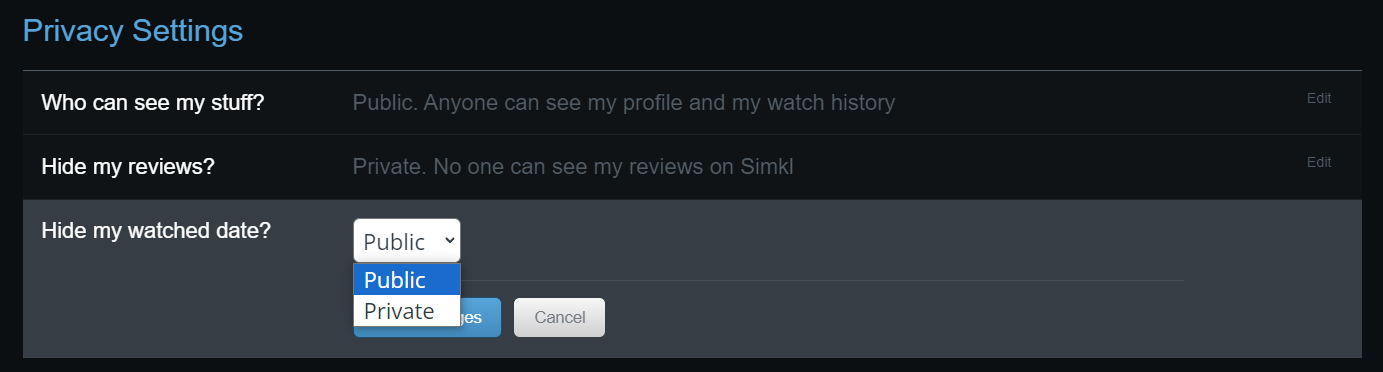 * **Public:** Anyone, can see your SIMKL Profile and Watch History