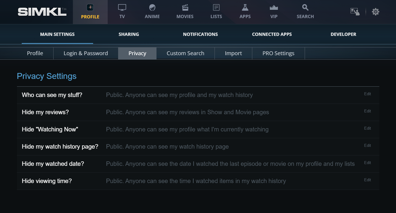 {% hint style="info" %} <mark style="color:yellow;">**By default, all SIMKL profiles are public**</mark>, meaning that everyone can see your watchlists and imported data. However, you have the option to <mark style="color:red;">make your profile and watchlists private</mark>. To do this, go to your [privacy settings on the SIMKL](https://simkl.com/settings/privacy/) website and choose the desired level of privacy for your profile.