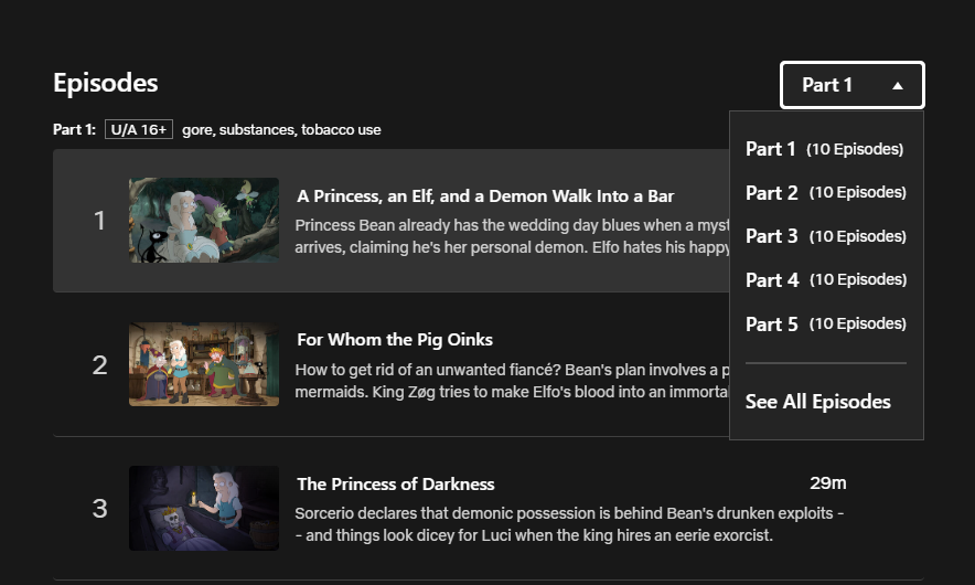 * On **Netflix**, the show is split into 5 distinct **Parts**, each with 10 episodes, with gaps between release dates.