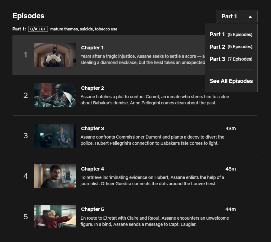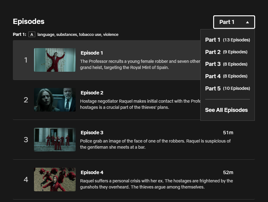 | **Netflix**      | 5 Parts, 50 episodes | Each part contains 10 episodes. Netflix uses a “Part” structure instead of seasons. |